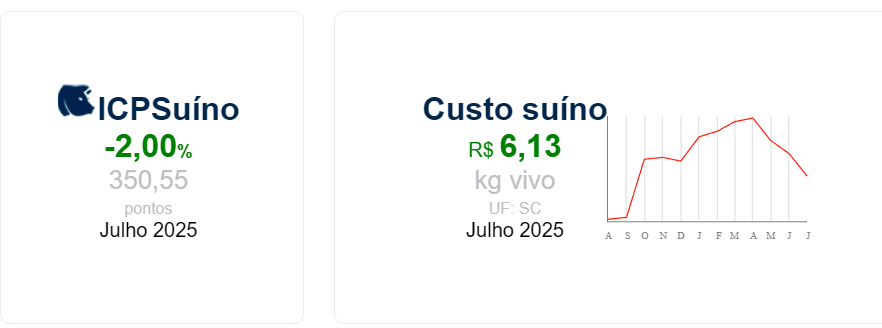 Os custos de produção de suínos e de frangos de corte voltaram a recuar em junho de 2025, marcando o terceiro mês consecutivo de queda, segundo levantamento da Embrapa Suínos e Aves, por meio da Central de Inteligência de Aves e Suínos (CIAS). No caso dos suínos produzidos em Santa Catarina, o custo por quilo do animal vivo fechou o mês em R$ 6,25, o menor valor registrado no ano, com redução de 1,13% em relação a maio. Mesmo com essa retração, o Índice de Custo de Produção de Suínos (ICPSuíno) acumula alta de 0,74% em 2025 e de 7,07% nos últimos 12 meses, atingindo 357,70 pontos. A ração, que responde por mais de 71% das despesas no ciclo completo, também apresentou queda de 1,82% no mês.