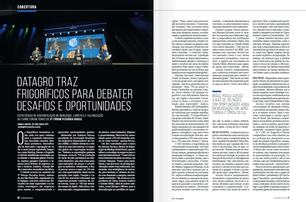 O debate ocorreu no contexto do 5º Fórum Pecuária Brasil, realizado em São Paulo (SP), organizado pela Datagro, com foco central nas discussões do setor exportador e as decisões estratégicas das empresas para manter a competitividade e aproveitar oportunidades globais.