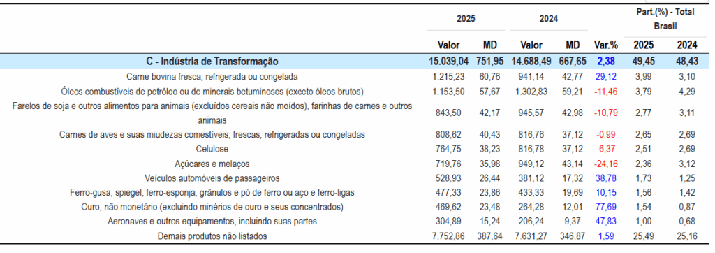 O desempenho das exportações de proteína animal contribuiu para o crescimento de 0,3% nas exportações totais do Brasil em abril de 2025, que somaram US$ 30,4 bilhões. A carne bovina se destacou como um dos principais produtos da indústria de transformação, que cresceu 2,4% em valor exportado.
