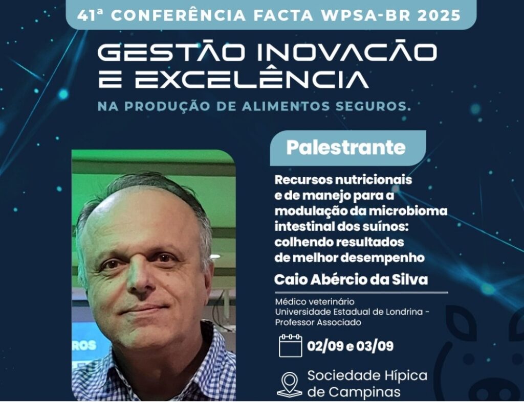 O professor Caio Abercio da Silva, da Universidade Estadual de Londrina (UEL), será um dos palestrantes da 41ª Conferência FACTA WPSA-Brasil, programada para 2 e 3 de setembro de 2025, em Campinas (SP). O especialista apresentará pesquisas e estratégias sobre “Recursos nutricionais e de manejo para a modulação do microbioma intestinal de suínos”, tema central para a produção suína de alta performance.